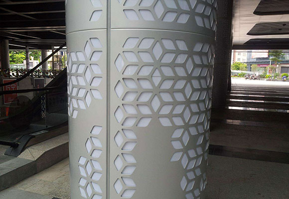 包柱蜂窩鋁單板是為室內外柱子裝飾定制的產品,傳統的柱子一般用到大理石,但大理石材料的限制性無法滿足建筑裝飾發展的需求。因此包柱鋁單板其優越的環保性能及造型工藝性得到廣泛使用,可根據不同的設計要求加工成不同規格的包柱鋁單板產品,也可以在包柱鋁單板產品表面鏤空成不同的圖案.而且省空間省成本。